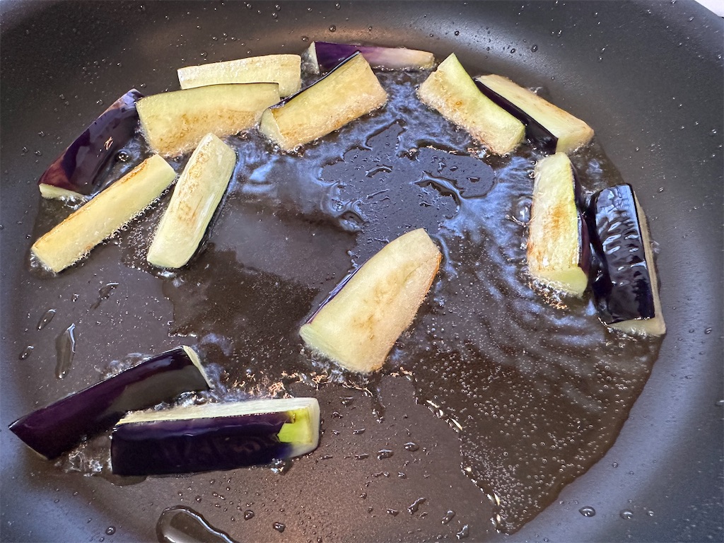 フライパンにオリーブオイルを入れて、強火で4等分にしたナスを焼いていきます。