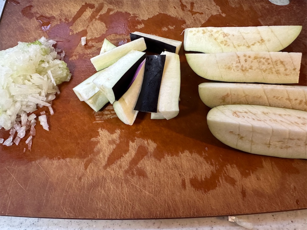 玉ねぎはみじん切りに、ナスは上の半分はくし切りに、した半分は縦に4等分にします。