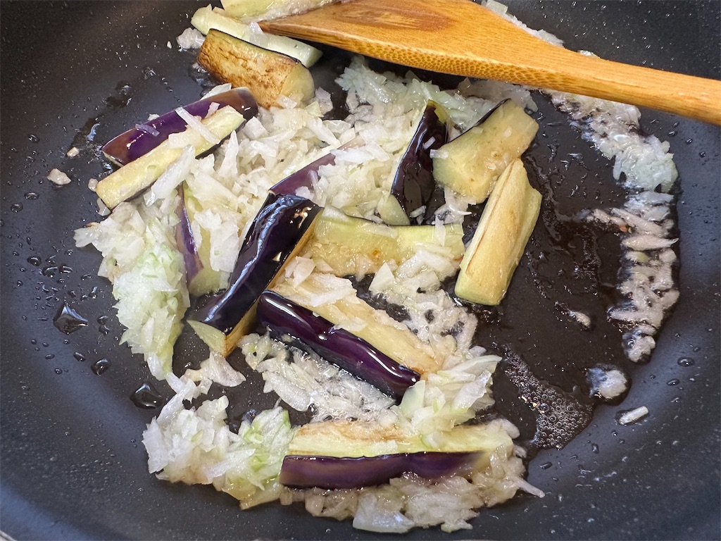 フライパンは洗わず、オリーブオイルを入れて、強火でくし切りにしたナスを炒めます。